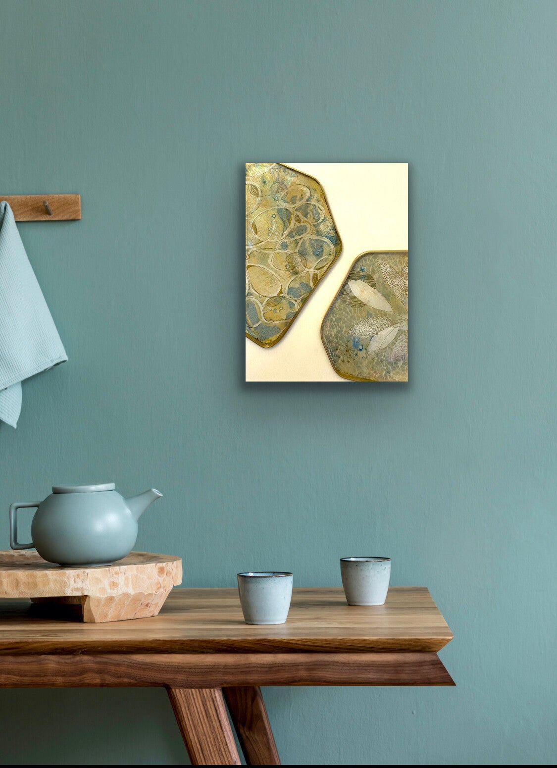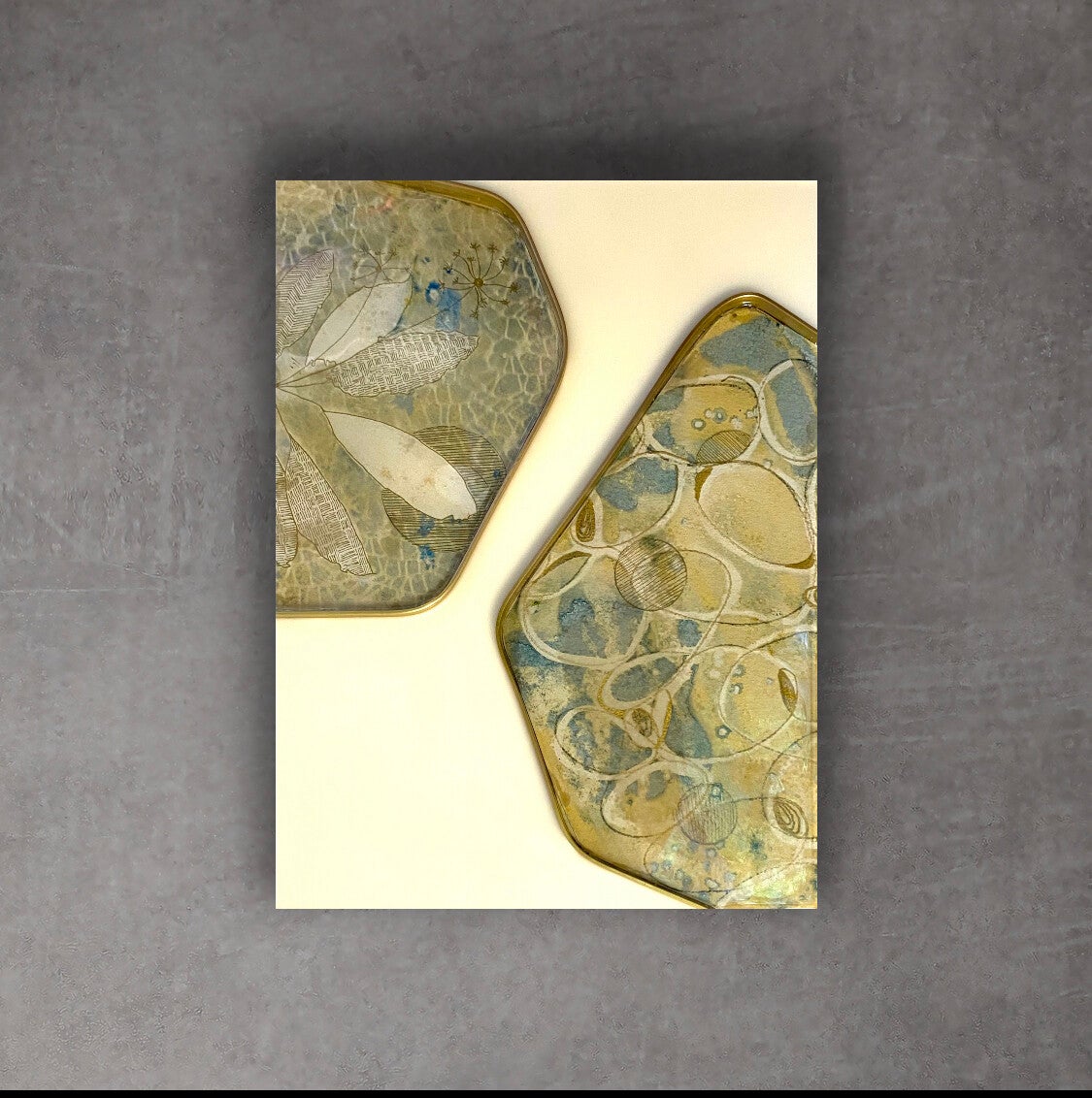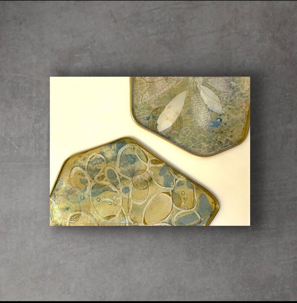 Encaustic (Bienenwachs und Resinharz) mit Messingumrandungen und Collageelementen, die in Cyanotypieverfahren hergestellt wurden und mit glänzendem Resin überzogen worden sind. Holzkörper mit 4 cm Tiefe. Benötigt keine Rahmung. Ein spannendes Verhältnis zwischen dem matten negative space und glänzenden Collageelementen.